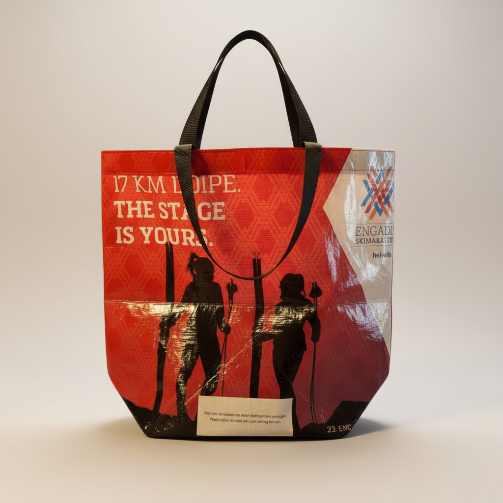 Aus den übrig gebliebenen Effektensäcken des Engadin Skimarathon 2024 haben wir gemeinsam mit dem Verein Movimento in Samedan praktische Einkaufstaschen erstellt. Die Taschen sind in einer limitierten Auflage erhältlich.